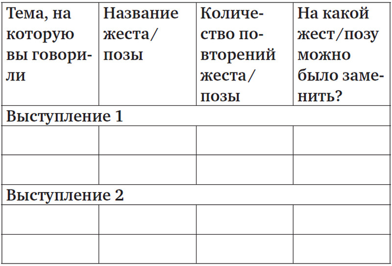 Я не буду детально описывать каждый жест. Лишь предлагаю вам выполнить практическое задание: запишите себя сами или попросите кого-то из друзей записать вас на видео, а затем посмотрите и разберите его. Вы увидите много жестов, а возможно, и позы, о которых раньше не думали или не считали, что они вам свойственны. Сейчас важно отследить именно те жесты и позы, которые мы с вами исключаем, чтобы выглядеть ярче и увереннее при выступлениях.