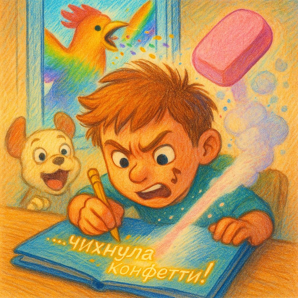 2. Ластик. Не простой кусок резины, а облачко из розовой пены, искрящееся на краях перламутровыми блёстками. Оно тихо парило на сантиметр над столом.