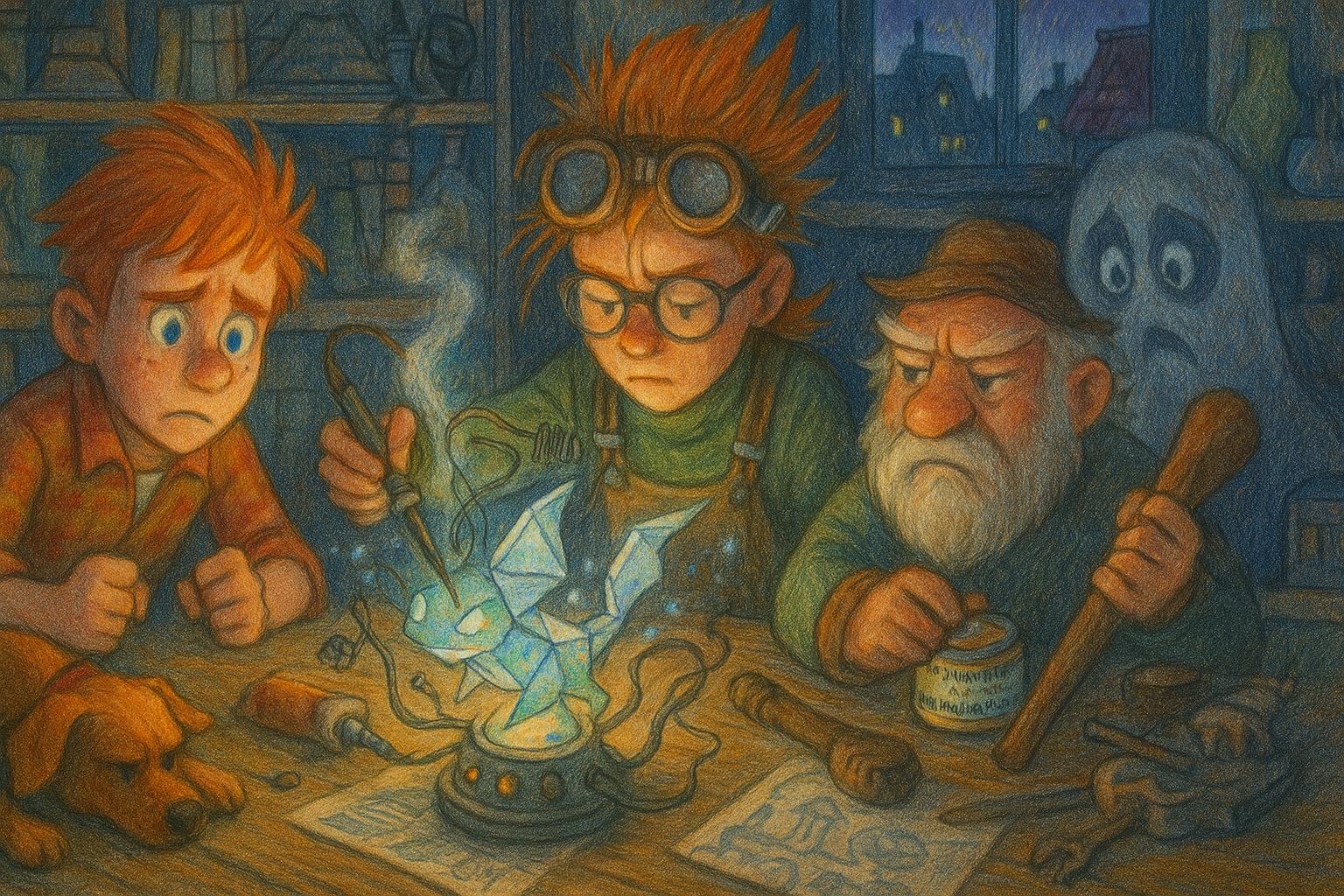 Джо-Джо сжал кулаки. Пустота в памяти ныла, как синяк. Он посмотрел на друзей: на Гизмо, спаивающую проводами что-то сложное и блестящее; на Ворчуна, мрачно натирающего посох мазью "От Ушибов и Гномьей Досады"; на Пусика, сливающегося с тенью книжного шкафа; на Бублика, чей нос теперь был их компасом в этом странном тумане.