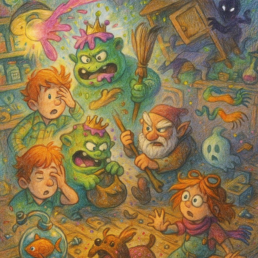 Это было похоже на взрыв в лаборатории безумного алхимика. Банки с «Икотой для Пингвинов», «Радужной Пылью» и «Запахом Старых Книг» грохнулись на пол, разбиваясь вдребезги. В воздух взметнулось буйство красок и запахов: облако изумрудной пыли, розовых блесток и фиолетового тумана накрыло комнату густым, непроглядным покрывалом. Все закашлялись, замахали руками, спотыкаясь о скользкий пол и разбросанные винтики. Пусик завизжал так пронзительно, что стал полностью невидимым от испуга, оставив лишь дрожащие шарфы, парящие в воздухе.