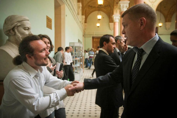 Потом он двинул в политику. Держался в тени. Но! В октябре 2011 года сопровождал президента Медведева во время последнего визита на журфак МГУ. И вот, как принято выражаться в таких случаях, интернет взорвался. Не понимаю я той пульсирующей бури в стакане ЖиЖи, которую вызвала публикация фотографии, на которой заведующий кафедрой новых медиа и теории коммуникации факультета журналистики МГУ двумя руками обхватил могучую демидовскую длань. Иллюстрация трактовалась блогерами однозначно: Иван Засурский подобострастничает пред кремлевским чиновником Иван Иванычем Демидовым.