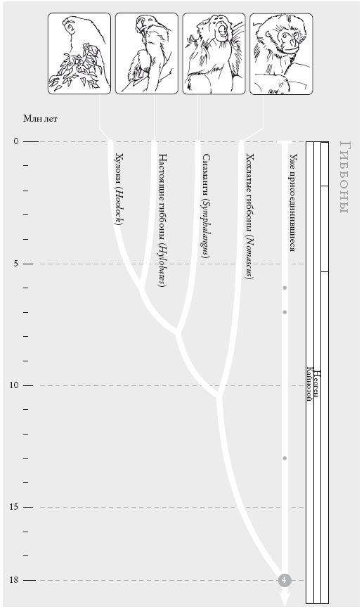 На рандеву № 4 мы встречаем крупную группу пилигримов. И теперь могут возникнуть проблемы с установлением родства. (Чем дальше, тем затруднительнее это сделать.) Существует двенадцать видов гиббонов, принадлежащих к четырем основным группам. Это Bunopithecus (группа, представленная одним видом, известным как хулок); настоящие гиббоны Hylobates – шесть видов, самый известный – белорукий гиббон (Hylobates lar); сиаманг (Symphalangus) и номаски (Nomascus) – четыре вида “хохлатых” гиббонов. Сейчас я объясню, как построить схему эволюционных отношений, или филогению, для этих четырех групп.