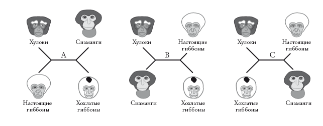 Любая неукорененная кладограмма может стать укорененной – для этого нужно указать самую старшую точку на древе (“корень”). Некоторые исследователи – те, на которых мы ссылались при рассмотрении древа в начале этого рассказа, – предлагают для гиббонов укорененную кладограмму слева. Другие предпочитают укорененную кладограмму справа. На первой схеме хохлатые гиббоны (номаски) представлены дальними родственниками всех остальных гиббонов. На второй схеме на их место помещен хулок. Несмотря на это различие, оба древа производны от одного неукорененного дерева (А). Кладограммы отличаются лишь корнем. На первой он расположен на ветви номасков, а на второй – на ветви Bunopithecus.