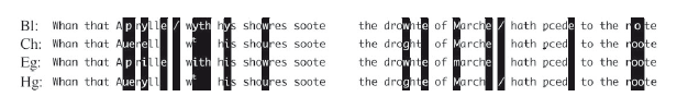 Кладограммы – как укорененные, так и неукорененные – отражают лишь порядок ветвления. Филограммы, или филогенетические деревья, похожи на кладограммы, но в них длина ветвей несет дополнительную информацию. Обычно длина ветвей отражает эволюционное расстояние: длинные ветви обозначают крупные изменения, а короткие – мелкие. На основе первой строки “Кентерберийских рассказов” можно построить следующую филограмму.