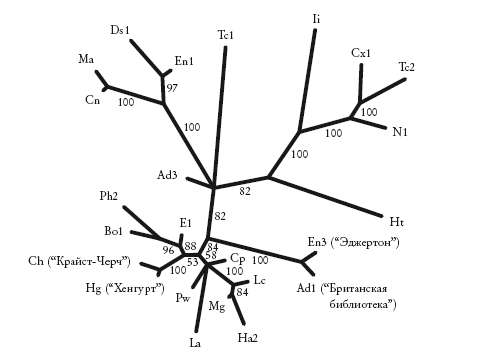 Неукорененное филогенетическое древо первых 250 строк 24 списков "Кентерберийских рассказов". Здесь представлен набор списков, изученный в рамках проекта "Кентерберийские рассказы". Сокращения соответствуют тем, что использованы в проекте. Схема построена методом парсимонии, на каждой ветви указаны индексы бутстреп-поддержки. Для четырех списков, которые обсуждаются нами, указаны их полные названия.