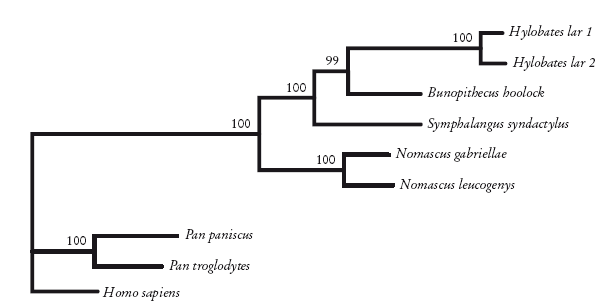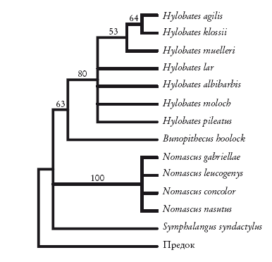 Вернемся к гиббонам. Принцип парсимонии предполагает существование четырех групп. Ниже приведена укорененная диаграмма, основанная на морфологических признаках. Здесь виды рода Hylobates (настоящие гиббоны) группируются вместе, как и виды рода Nomascus. Обе группы поддерживаются высокими индексами бутстреп-поддержки (указаны над ветвями). Однако в нескольких местах порядок ветвлений не определен. Хотя Hylobates и Bunopithecus вроде бы формируют группу, индекс бутстреп-поддержки (63) представляется неубедительным для тех, кто умеет читать подобные руны. Морфологических признаков для построения древа недостаточно.