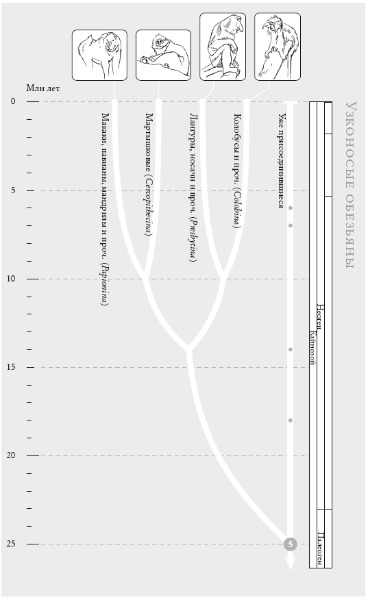 Приближаясь к рандеву № 5 и готовясь к встрече с сопредком № 5 (нашим прародителем приблизительно в полуторамиллионном поколении), мы пересекаем важный (хотя и произвольно выбранный) рубеж. Впервые с начала путешествия мы вступаем в другой геологический период, палеоген, и оставляем неоген. В следующий раз, пересекая границу, мы окажемся в населенном динозаврами мире – в меловом периоде. Рандеву № 5 проходит около 25 млн лет назад, в олигоценовую эпоху палеогена. Это последняя остановка на дороге в прошлое, во время которой климат и растительность покажутся нам знакомыми. Дальше мы не увидим открытых поросших травой пространств, типичных для неогена, или мигрирующих стад травоядных. Около 25 млн лет назад Африка была полностью изолирована. Даже от ближайшей к ней Испании ее отделял пролив, по ширине равный сегодняшнему Мозамбикскому проливу. На этом огромном острове – Африке – наша команда пополнится новыми участниками, весьма ловкими и сообразительными. Встречайте обезьян Старого Света – первых наших хвостатых спутников.