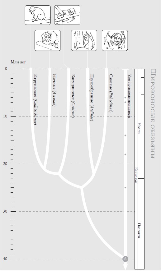 Широконосые обезьяны. Филогенетическое древо примерно для ста видов обезьян Нового Света. Филогения обезьян до сих пор вызывает разногласия, и я привожу общепринятую схему.