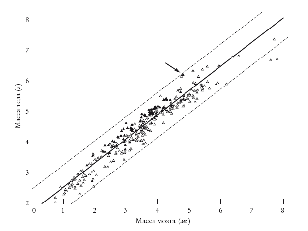 Логарифмическое соотношение массы головного мозга и тела у различных видов плацентарных млекопитающих. Закрашенные треугольники обозначают приматов. Стрелкой обозначен человек. Martin [185].