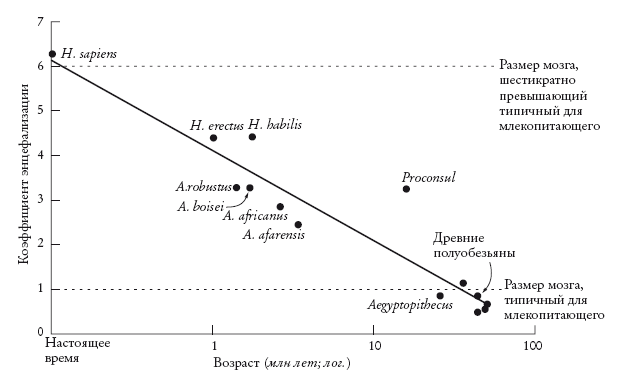 Отказ от названий позволяет рассуждать о том, почему мозг внезапно начал расти. Как оценить увеличение мозга гоминид и построить график зависимости среднего размера мозга от геологического времени? С единицами времени проблем не возникает: это должны быть миллионы лет. С размером мозга сложнее. Ископаемые черепа и слепки позволяют оценивать размер мозга в кубических сантиметрах, которые потом довольно легко перевести в граммы. Однако нам не обязательно нужен абсолютный размер мозга. У слона мозг крупнее нашего, и тем не менее мы с полным правом считаем себя умнее. Мозг тираннозавра был ненамного меньше нашего, однако это не мешает считать динозавров глупыми: относительный размер нашего мозга больше.