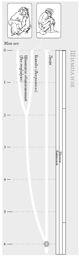 В Африке 5–7 млн лет назад нам уготована удивительная встреча. Мы впервые увидим пилигримов, принадлежащих к другому биологическому виду, точнее, к двум видам. Обыкновенный шимпанзе и карликовый шимпанзе (бонобо) объединились примерно за 4 млн лет “до” нашего рандеву. Наш общий предок – сопредок № 1 – наш общий прародитель примерно в 250-тысячном поколении.