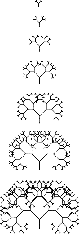 “Глубиной” рекурсии называется такое число веточек n-го порядка, которому позволяется вырасти, прежде чем процесс будет остановлен. На рисунке 2 показано, что будет, если задать компьютеру один и тот же алгоритм черчения, но с разными значениями глубины рекурсии. При высоких степенях рекурсии получается довольно запутанный узор, однако, как ясно видно из рис. 2, достигается он за счет того же самого простейшего правила ветвления. Несомненно, это именно то, что происходит и у настоящих деревьев. Система ветвей дуба или яблони выглядит сложной, но в действительности таковой не является. Правило, лежащее в основе процесса ветвления, элементарно. Просто оно снова и снова применяется в каждой растущей верхушке каждой веточки: ветви дают начало ветвям второго порядка, каждая из которых, в свою очередь, ветвям третьего порядка и так далее. Вот почему все дерево становится в итоге большим и ветвистым.
