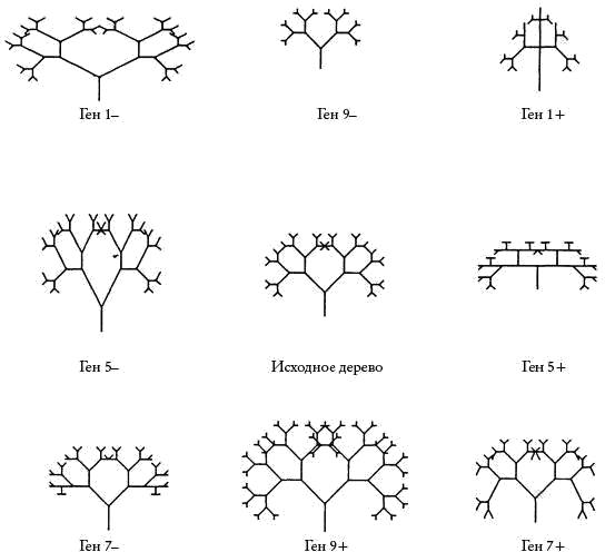 У каждого из этих деревьев имеется своя собственная, уникальная “генетическая формула” – численные значения всех девяти генов. Я не стал выписывать эти генетические формулы здесь, так как сами по себе они ничего вам не скажут. Это же, кстати, справедливо и для настоящих генов. Гены начинают значить что-либо, только когда в ходе белкового синтеза преобразуются в предписания для развивающегося зародыша. То же и в нашей компьютерной модели: численные значения девяти генов обретают смысл, только будучи переведенными в указания по росту древовидного узора.