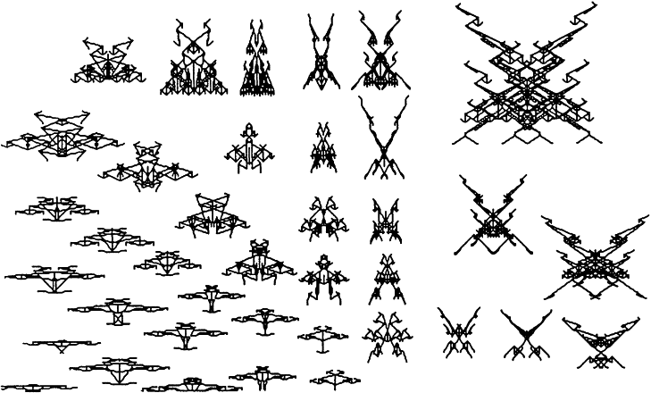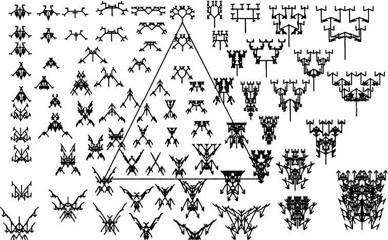 Увы, рисовать в девяти измерениях мы не умеем. Я стал искать способ, как выкрутиться, как нарисовать такую двумерную картинку, которая хотя бы отчасти могла передать, на что это похоже – перемещаться из одного пункта в другой по девятимерному генетическому пространству Страны биоморф. Тут можно пойти различными путями; я выбрал тот, который называю “уловкой с треугольником”. Взгляните на рис. 6. На вершинах треугольника расположены три произвольно выбранные биоморфы. Сверху – наше “исходное дерево”, слева – одно из моих “насекомых”. Та, что справа, никак не называется, но, по-моему, она прелестна. Как и все биоморфы, каждая из этой тройки имеет свой собственный набор значений генов, которым определяется ее уникальное положение в девятимерном генетическом пространстве.