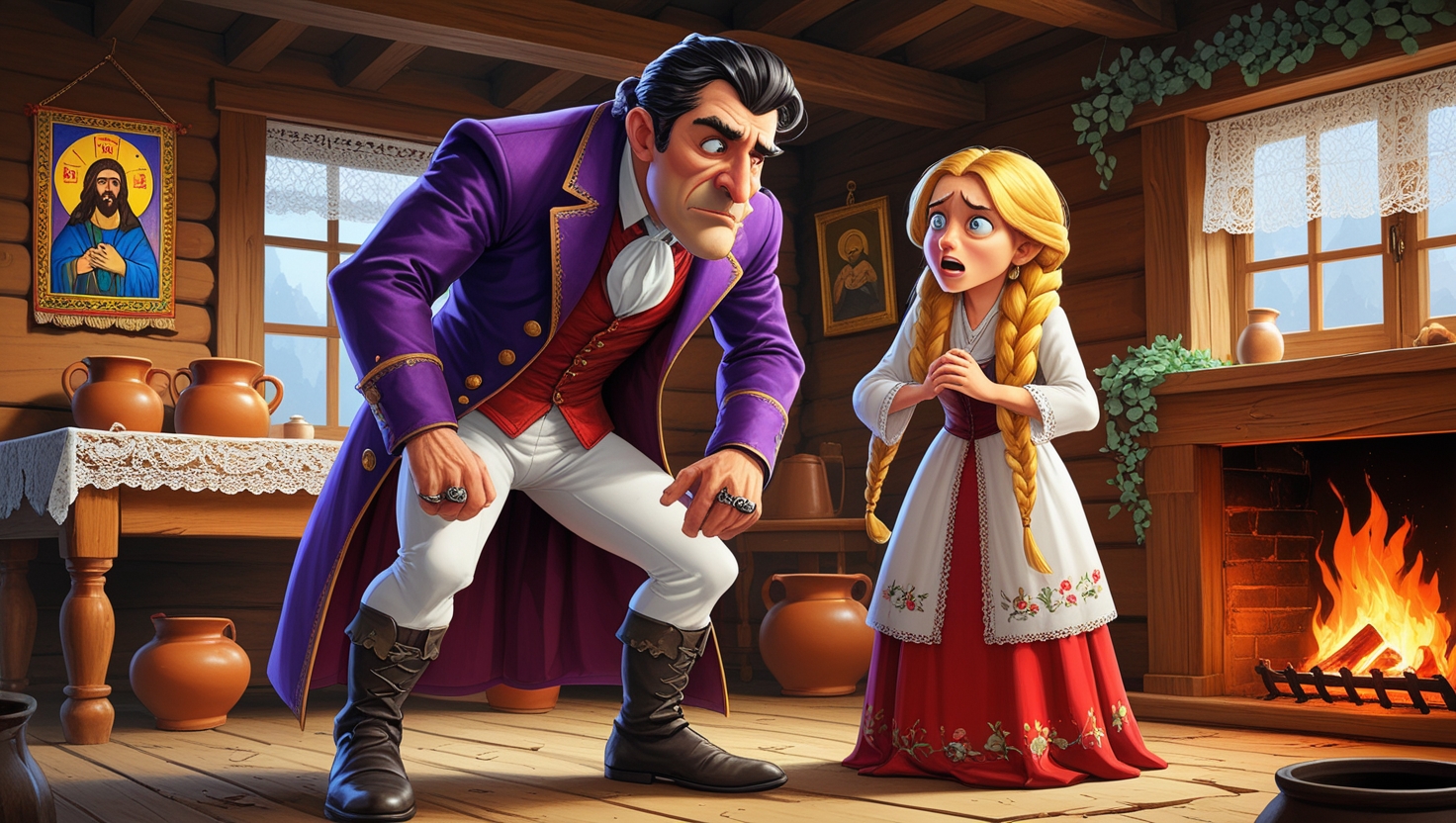 Priest: A stout man with a long, graying beard and bushy eyebrows. He wears a black cassock with a golden cross around his neck. His expression is stern and annoyed, with one hand raised in a dismissive gesture and the other hand resting on his hip. His dark eyes are narrowed, and his thick, bushy mustache twitches as he scolds Lyubasha.
