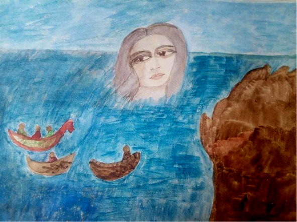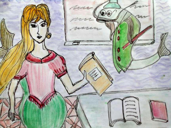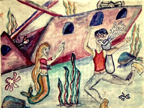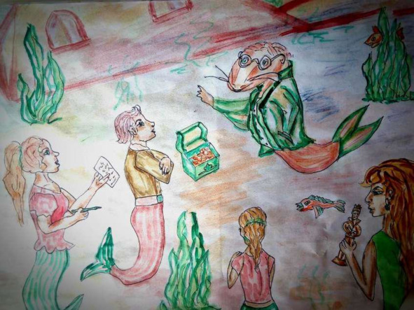 – А там в это время оказалась русалочка. Она тоже решила сплавать к затонувшему кораблю, куда приплывали с Сомом на экскурсю. В трюме она еще в прошлый раз обнаружила большую красивую вазу с вырезанными цветами и хотела ее забрать: