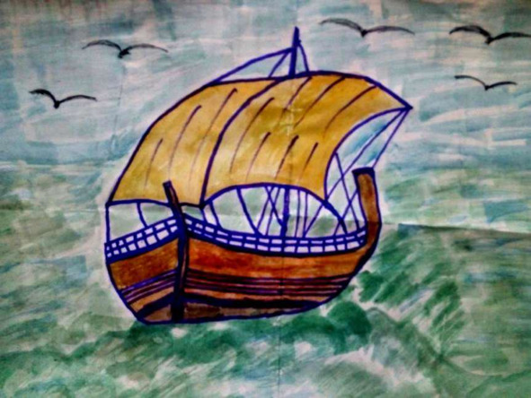И тут увидел совсем огромную рыбу с толстыми вытянутыми губами, как будто она искала, кого поцеловать. Ее вытаращенные, выпученные глазищи еще больше округлились, явно заметив принца: уж не его ли мне прдстоит поцеловать?! Но, передумав, она поспешила уплыть. Он только и успел дотронуться до ее хвоста, который выскользнул у него из рук. И в этот момент он обо что-то споткнулся. Рука его уцепиалсь за что-то круглое. Рассмотрев внимательно, он понял, что это штурвал корабля.