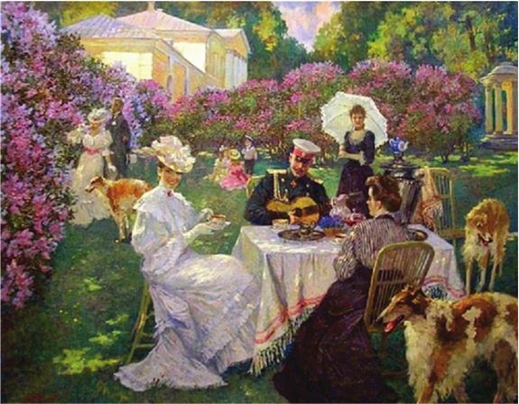 Русский художник Владимир Сергеевич Первунинский. «Чаепитие в сиреневом саду»