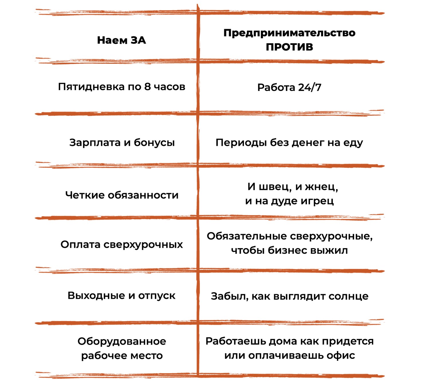 В найме у вас есть выходные, отпуск, стабильная зарплата (а иногда даже бонусы). За это нужно выполнять обязательства перед работодателем. Стабильность – это очень соблазнительно. Не каждый готов (да и не каждому нужно) от этого отказываться в пользу предпринимательства.