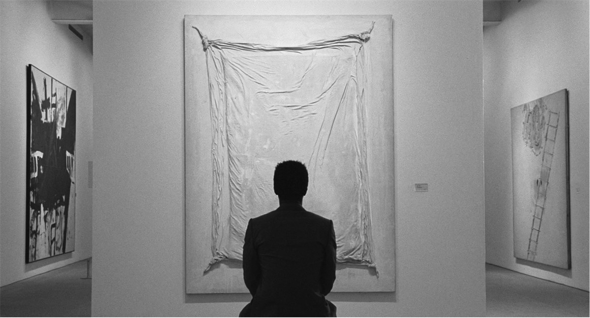 Таким образом, в «Пределах контроля» внешнее важнее внутреннего, которое остается нерасшифрованным. И в этом первый признак невиданного даже для экспериментатора Джармуша радикализма. Обходясь без биографий, характеров и имен, он довольствуется образом. Поэтому столь существенную роль в строении фильма играют походы Одиночки именно в музей королевы Софии – главное мадридское собрание современного искусства. Некоммуникативность живописи ХХ века здесь ставится кинематографу в пример и в укор: от расчлененности «Скрипки» Джармуш постепенно приходит к чистому белому полотну «Большая простыня» (1968) абстракциониста Антони Тапиеса, любителя «бедного» материала и конкретных фактур.