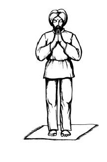 Важна и молитвенная поза в положении стоя (намастэ). Вы складываете руки лодочкой на груди, большие пальцы упираются в яремную впадину, выравнивается спина, смыкаются стопы. Указательный и безымянный пальцы рук смотрят на кончик носа, взгляд направлен внутрь головы, на предмет концентрации или кончик носа.