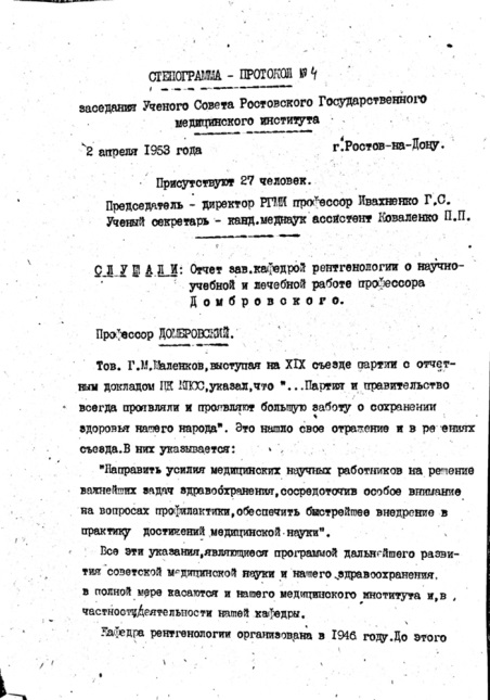 Та самая стенограмма (фрагмент) заседания учёного совета с оценкой «учебной и лечебной работы профессора Домбровского»