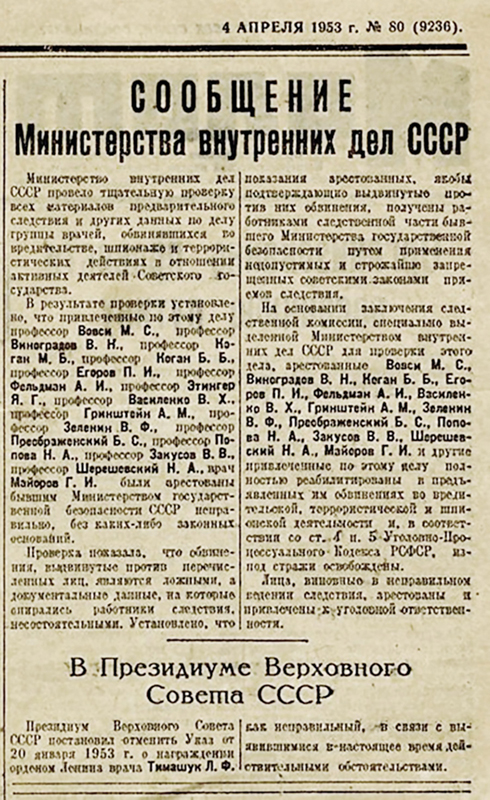 Через два дня, 4 апреля 1953 года, в «Правде» публикуется сообщение Министерства внутренних дел СССР. Дело «врачей-убийц», якобы по наущению американской и израильской разведок умертвивших членов Политбюро Щербакова и Жданова и готовивших убийство Сталина и других членов правительства, было сфальсифицировано «руководством бывшего МГБ недопустимыми методами следствия». Все арестованные по этому делу освобождены 3 апреля.