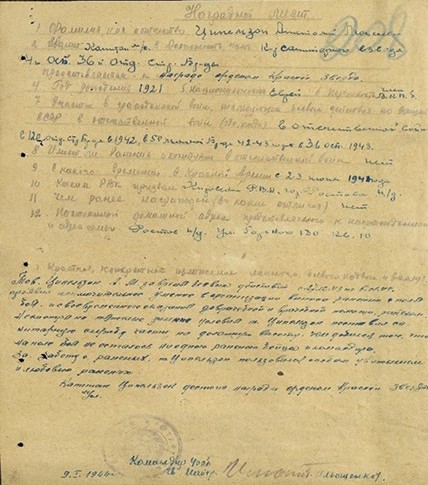 Наградной лист к ордену Красной Звезды. 1944 г.