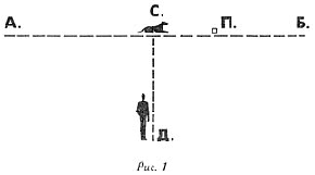Собака все время лежит в точке С, дрессировщик помещается на линии СД, а подачка положена в какой-нибудь точке П линии АВ (рис. 1).