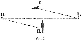 Укладываем Фрама между двух подачек, сами становимся лицом к нему и посылаем его направо; тотчас, как он схватит первую подачку, мы свистим, Фрам ложится и смотрит на нас; тогда жестом левой руки мы посылаем его налево и он находит вторую, жестом же мы подзываем его к себе. Таким образом, исполнено первое движение того правильного поиска, которому мы желаем его научить (рис. 3).