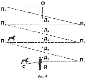 Разложим на дворе, по возможности не на самой земле, а выше: на скамейках, тумбах, столах, пнях, кирпичах и т. д. – целый ряд подачек в точках П, П1… П5. Затем приведем нашего воспитанника и уложим его в точке С, сами поместимся в точке Д – и урок начнется (рис. 4).