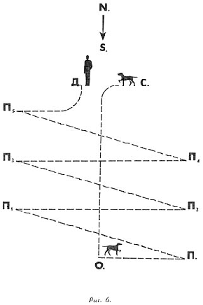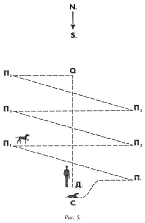 Укладываем Фрама в точке С и даем ему понюхать поноску, затем идем в точку П, из точки П в точку П1, оттуда в точку П2 и т. д., возвращаясь через точки П5, О, Д. Постараемся уронить поноску в точке П так, чтоб Фрам, лежащий все время в точке С, но взглядом следящий за нами, не мог заметить места, где находится инструмент, дающий желанную подачку.