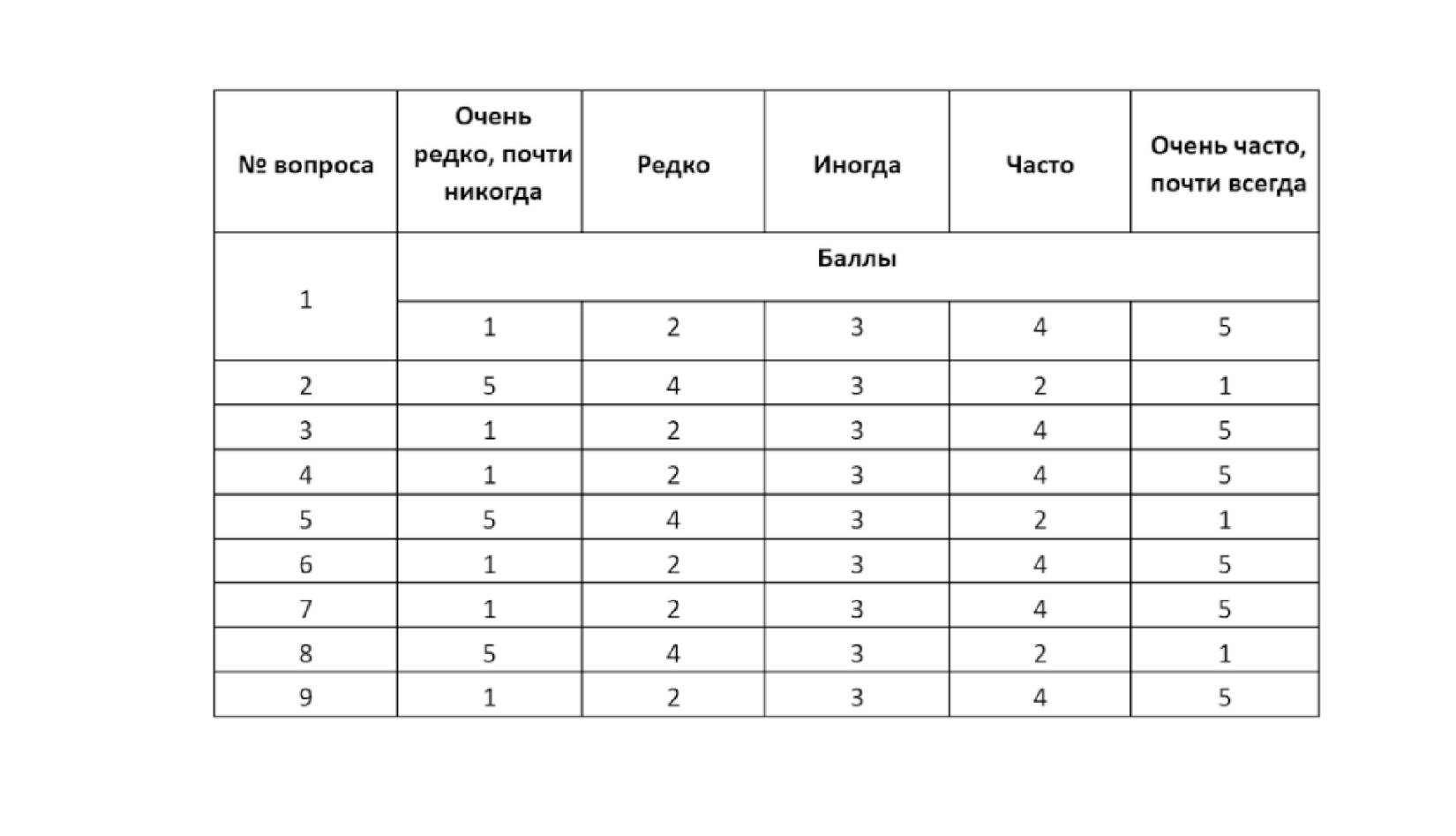 Ответы оцениваются следующим образом: «безусловно, да» – 4 балла; «пожалуй, да» – 3 балла; «пожалуй, нет» – 1 балл; «безусловно, нет» – 0 баллов.