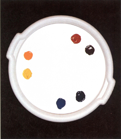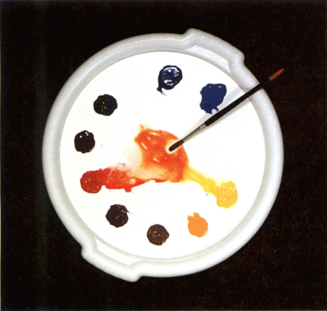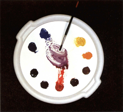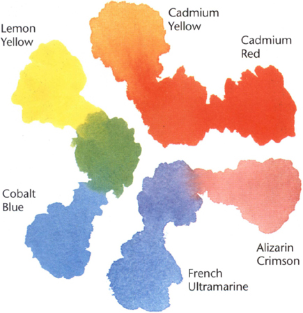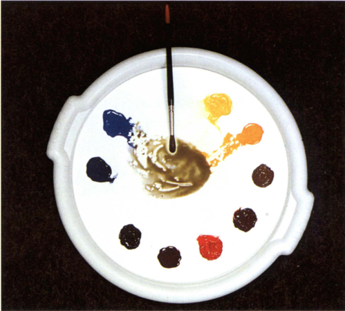 For example, you may have mixed yellow and red and finished using the orange that resulted. If some of the remnants of this are inadvertently left on the palette (or you have not cleaned your brush properly) you will find when you mix the red with blue to make a pleasant violet, for instance, that the result is often very drab. The reason is that some of the previous mixture blends with the new mixture. As the orange residue contains yellow, when added to your two new colours, red and blue, the result is a blend of all three primaries again. So, to avoid this, clean the mixing area often or keep different colour mixes on separate sides of the palette and clean your brushes properly in between mixes.