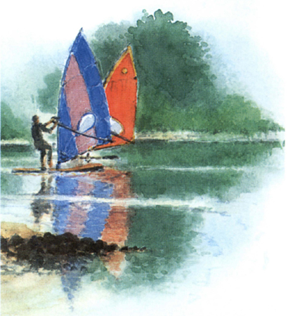 Using pairs of adjacent primaries mixed together results in the essential vivid colours needed to portray the sails. The strong green colours of the background trees make the sails stand out even more.