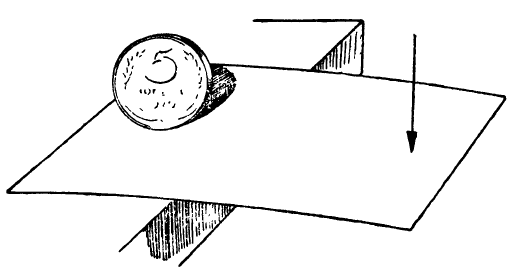 Рубль на листке бумаги. Положите на край стола открытку так, чтобы две трети ее выступали, а на открытку у самого края поставьте на ребро серебряный рубль или пятак (рис. 1). Конечно, это место стола не должно быть покрыто скатертью, и стол должен быть ровный, а то монета будет падать или скатываться. Возьмите затем линейку или какую-нибудь палочку и быстро ударьте по свешивающемуся концу открытки. Если удар будет сильный и быстрый, рубль не шелохнется, а открытка вылетит из-под него и упадет на пол.