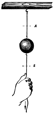 Шар на шнурке. Если повесить (рис. 2) шар или гирю на очень тонком шнурке А, а снизу укрепить другой такой же шнурок Б и медленно потянуть его вниз, то оборвется верхний шнурок, на котором висит шар. Это понятно: к верхнему шнурку приложены и тяга руки, и вес шара. Но можно при желании разорвать не верхний шнурок, а нижний. Если, немного приподняв конец нижнего шнурка, затем быстро и сильно дернуть его вниз, то оборвется именно он, а не верхний. Почему это произойдет? Чтобы сообщить шару большую скорость в короткое время, нужна сила больше той, какую способен выдержать нижний шнурок. Шар вследствие инерции не успевает сдвинуться с места или сдвигается на такое маленькое расстояние, что верхний шнурок только чуть вытягивается и не успевает порваться. Итак, быстро дергая или медленно натягивая, мы можем по желанию обрывать верхний или нижний шнурки.