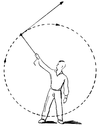 Когда мы вращаем камень, привязанный к шнурку, то в каждой точке своего кругового пути он по инерции стремится двигаться по прямой линии, касательной к кругу (рис. 4). Но этому мешает шнурок, постоянно изменяющий направление движения камня. В результате камень через шнурок начинает тянуть нашу руку в сторону. Это действие вращающегося тела называется центробежной силой.