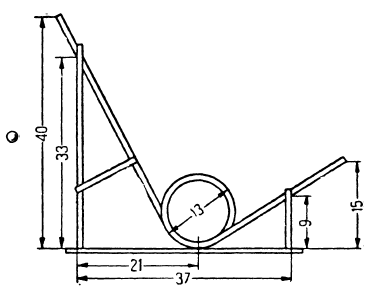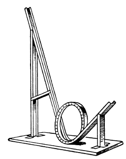 Теперь нужно испытать петлю до установки на подставку. Лучше всего катить в этой петле шарик. Шарик можно подобрать от старого шарикоподшипника. Можно скатать его из черного хлеба или из глины, только поточнее. Поставьте петлю на стол в том положении, в котором она будет закреплена, и попробуйте пустить шарик с конца более высокого желоба. Он должен быстро пробежать по всей петле и выскочить с короткого конца. Бывает, что шар доходит только до верха петли и оттуда срывается вниз.