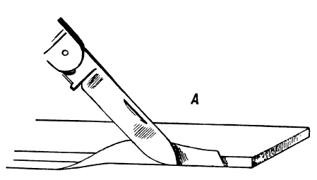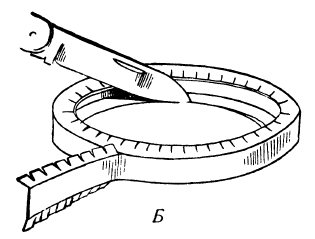 Вырежьте из плотной бумаги полосу шириной 3,5 сантиметра и длиной 50 сантиметров и два кружка диаметром 13 сантиметров. На полосе проведите карандашом две прямые линии на расстоянии 1 сантиметра от краев. По этим прямым полосу нужно аккуратно загнуть. Сделать это легче всего так. Наложите на полосу линейку точно по одной из прямых и подложенным под выступающий край бумаги ножом проведите вдоль линейки, пригибая край бумаги к ребру линейки. Этот прием показан на рис. 8, А. Так же сделайте и второй сгиб. Загнутые сантиметровые края полосы надрежьте ножницами приблизительно через каждые полсантиметра. Теперь смажьте края одного кружка клеем и, накладывая один за другим зубцы бумажной полосы, хорошенько приклейте ее к кружку. Клеить надо так, чтобы кружок оказался внутри петли.