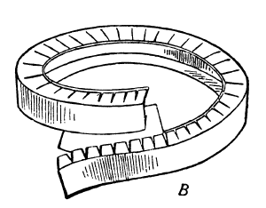 Когда клей подсохнет, вырежьте середину кружка, как раз по концам зубцов (рис. 8, Б). Таким же способом приклейте ко второму кружку другую сторону полоски и также вырежьте его середину. В том месте, где приклеено начало полоски, петлю нужно разрезать. Теперь ее можно так раздвинуть, чтобы она пошла по винтовой линии. Изготовленная полоска бумаги оказалась длиннее окружности кружка примерно на 10 сантиметров. Эту часть полоски нужно тоже закруглить. Вырежьте из бумаги еще один круг, такого же диаметра, как и первые два, разрежьте его на четыре части и вклейте четвертушки в готовую часть петли изнутри. К этой вклеенной части приклейте остаток полоски (рис. 8, В) и срежьте все лишнее.