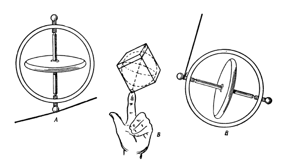 В игрушечных магазинах можно купить тяжелый металлический волчок, укрепленный в металлическом кольце. Он запускается тонким и прочным шнурком. При быстром вращении волчок сохраняет вертикальное положение, если его поставить на один из шариков кольца, и даже оказывает сопротивление, когда его хотят повалить. При замедлении вращения волчок постепенно ложится на бок и наконец падает.