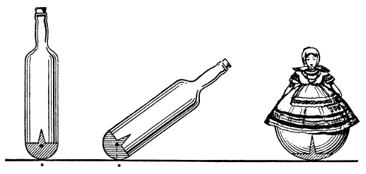 Свинец можно сначала отрезать ножом, а затем обровнять напильником. Вместо свинца можно взять короткий гвоздь с большой полукруглой шляпкой (такими гвоздями часто прибивают обивку к мебели). Если бузинную бутылочку с тяжелым свинцовым дном окрасить, чтобы свинец, приклеенный снизу, был незаметен, – никому и в голову не придет, что центр тяжести ее расположен очень низко. Наша бутылочка, как бы мы ее ни положили, сейчас же примет вертикальное положение. Такое равновесие называется устойчивым.