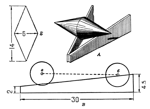Опыт с двойным конусом. Аккуратно сделайте из плотной бумаги два конуса с диаметром основания 6 сантиметров и высотой 7 сантиметров (рис. 12, Б). Потом склейте их основаниями и дайте хорошенько высохнуть. Еще лучше выточить такой двойной конус из дерева. Затем выпилите из фанеры две дощечки длиной по 30 сантиметров и высотой с одной стороны 2 сантиметра, а с другой – 4,5 сантиметра (рис. 12, В). Наклонные ребра дощечек должны быть совершенно ровными и гладкими (их нужно хорошо протереть стеклянной бумагой).