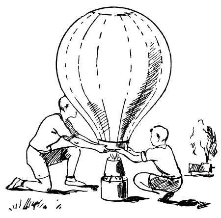 Разведите во дворе небольшой костер из бумаги и стружек, облитых керосином. Костер лучше всего разводить в старом ведре, а над ведром поместить большую опрокинутую воронку. Воронка направит горячий воздух в отверстие. Два-три человека пусть держат шар за нижнее кольцо над костром, а двое во время наполнения должны поддерживать его с боков.