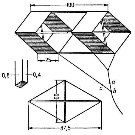 Для изготовления его приготовьте 4 сосновые рейки длиной 1 метр, сечением 8 x 4 миллиметра, две рейки длиной по 87,5 сантиметра такого же сечения и две рейки длиной по 50 сантиметров такого же сечения. Рейки длиной по 87,5 и 50 сантиметров свяжите в два креста и к концам их привяжите концы длинных реек. Рейки должны быть из очень сухой и прямослойной сосны, без сучков.