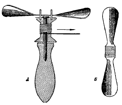 Но можно сделать винт отдельно и заставить его быстро вращаться и летать. Возьмите катушку от ниток и прибейте ее гвоздиком к какой-нибудь рукоятке так, чтобы она легко вертелась на этом гвоздике. Если шляпка гвоздика небольшая и катушка соскакивает с него, подложите под шляпку кусочек жести. Сверху в катушку вбейте два тонких гвоздика, уже без шляпок, как показано на рис. 16, А.