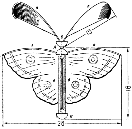 Возьмите бабочку двумя пальцами левой руки за пробку Д а правой закрутите резинки, поворачивая голову бабочки. Когда вы отпустите голову, резинки станут раскручиваться и завертят усики. Тогда выпустите бабочку из левой руки, и она быстро взлетит под потолок. Она очень смешно трепещет крыльями, летает вправо и влево, кувыркается и наконец, медленно, все так же трепыхаясь, опускается вниз.