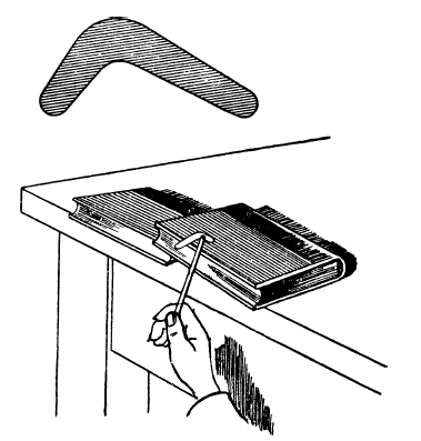 Возьмите почтовую открытку и вырежьте из нее угольник с тупым углом изгиба. Одна сторона этого угольника, как и в настоящем бумеранге, должна быть немного длиннее, а значит, и тяжелее другой. На рис. 18 видна фигура маленького бумеранга. Размер ее большого значения не имеет. Если такой бумеранг поместить на край наклонно положенной книги и ударить палочкой по выступающему более длинному концу, то он, быстро вращаясь, полетит вперед и, описав дугу, возвратится к вам.
