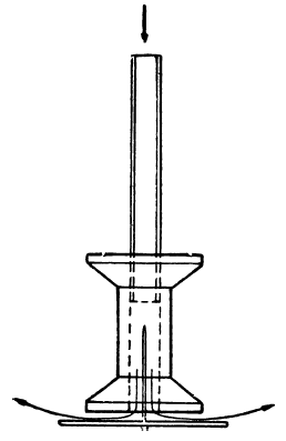 Опыт с катушкой. Для этого интересного опыта нужно иметь только старую катушку от ниток, кусок гладкого плотного картона, булавку и трубку. Вставьте трубку в катушку. Из картона вырежьте кружок диаметром 3 сантиметра и в центре его воткните булавку (рис. 19). Трубку с катушкой на конце возьмите в рот, снизу в катушку вставьте кружок с булавкой так, чтобы булавка вошла внутрь катушки, и сильно подуйте.